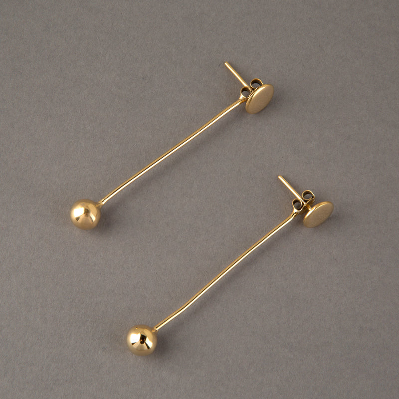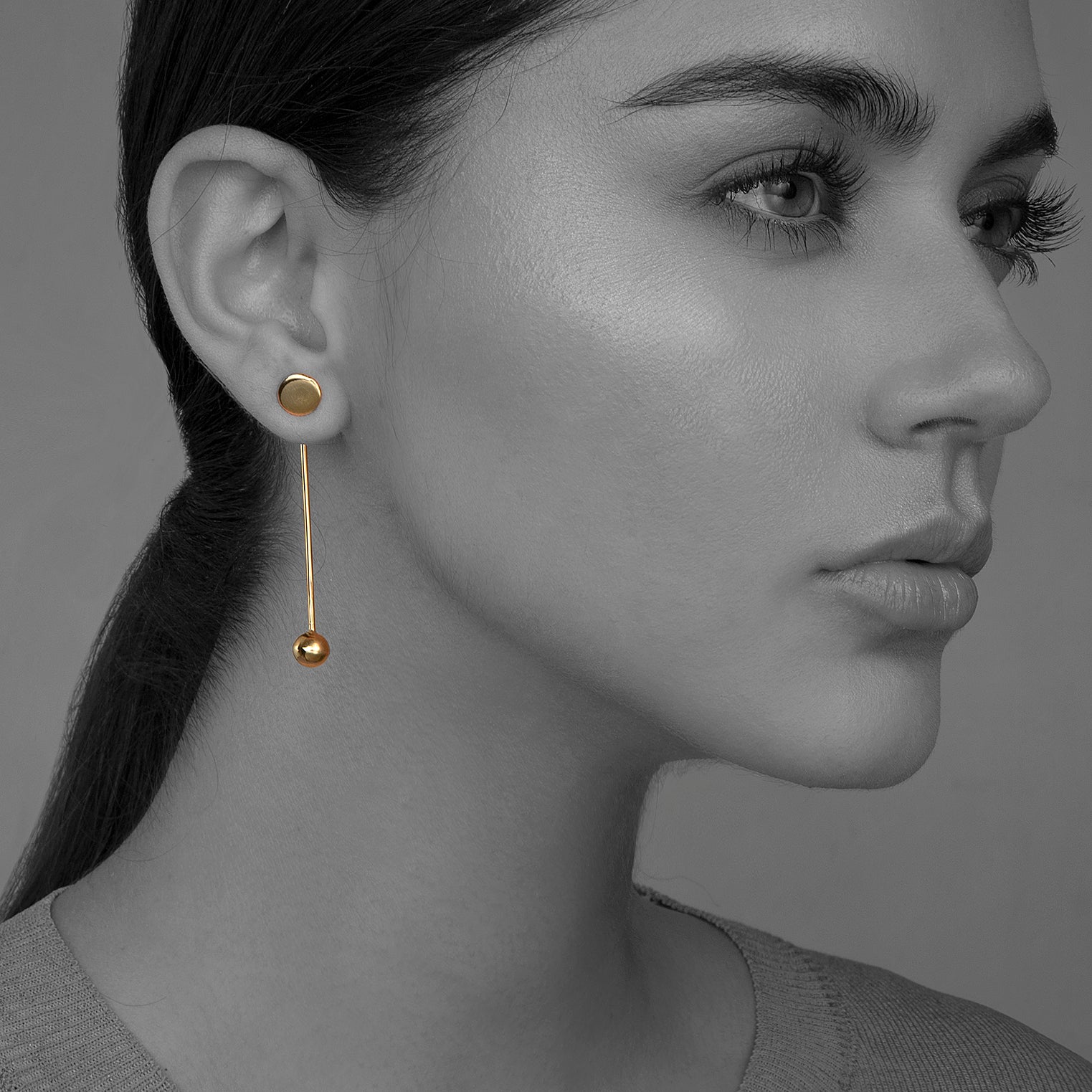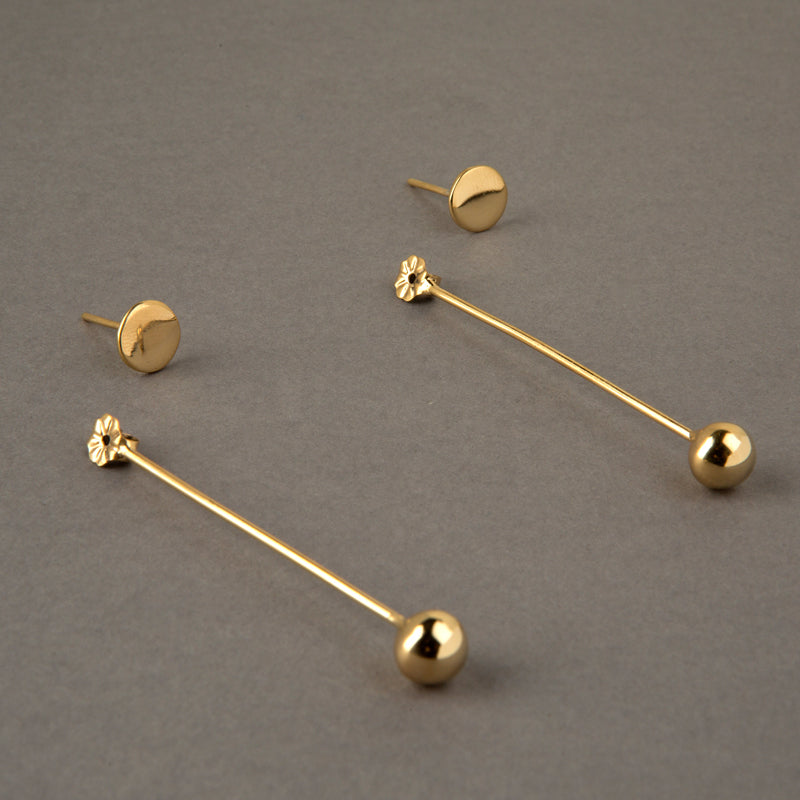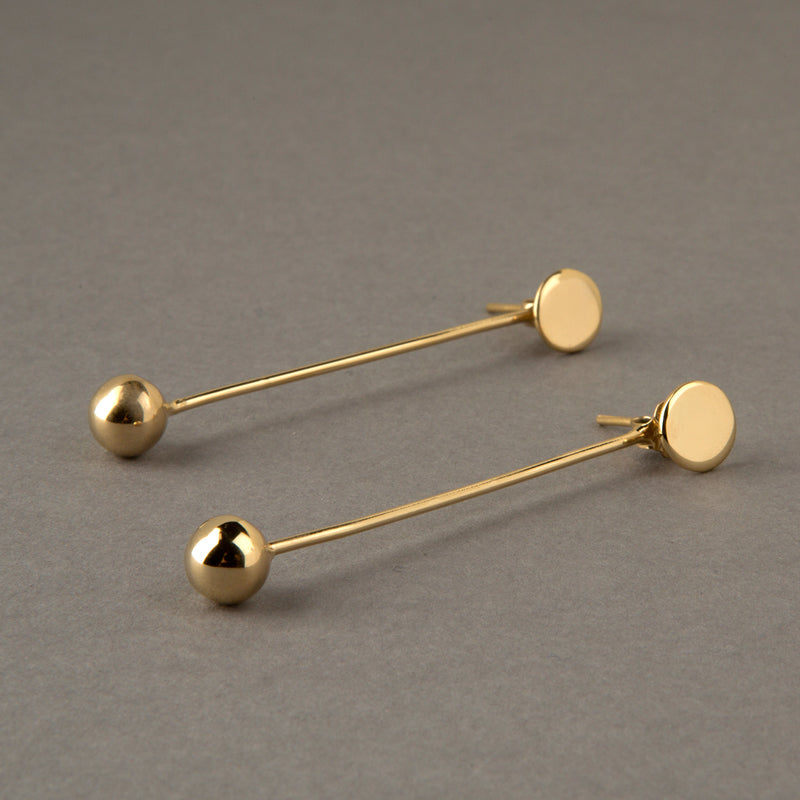 Aretes de plata 925 con baño de oro de 24K, de diseño contemporáneo. Elaborados a mano por artesanos mexicanos. Broquel 0.7 cm de diámetro/arete 5 cm de largo.