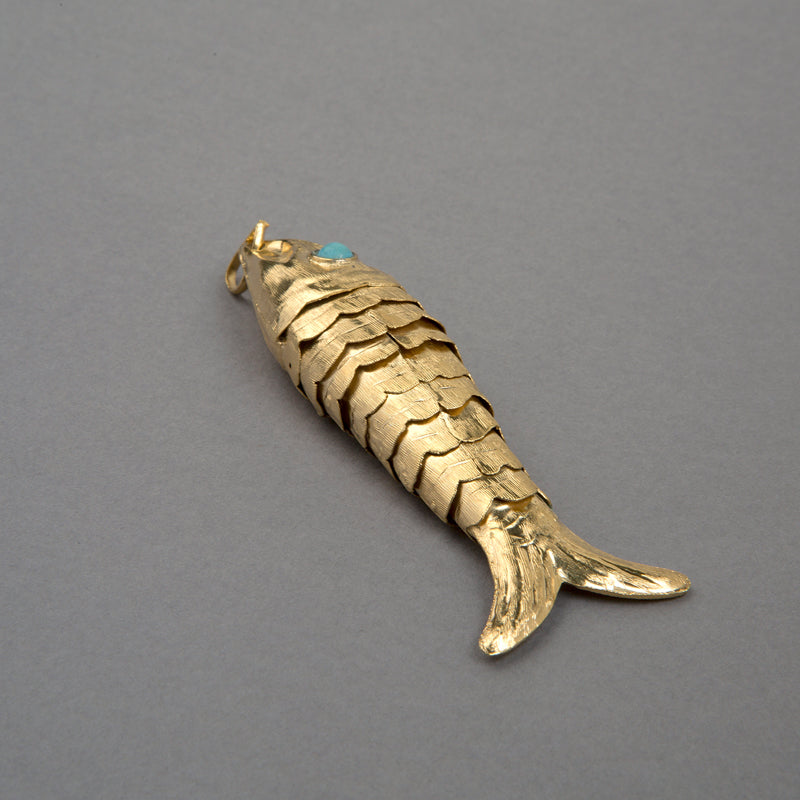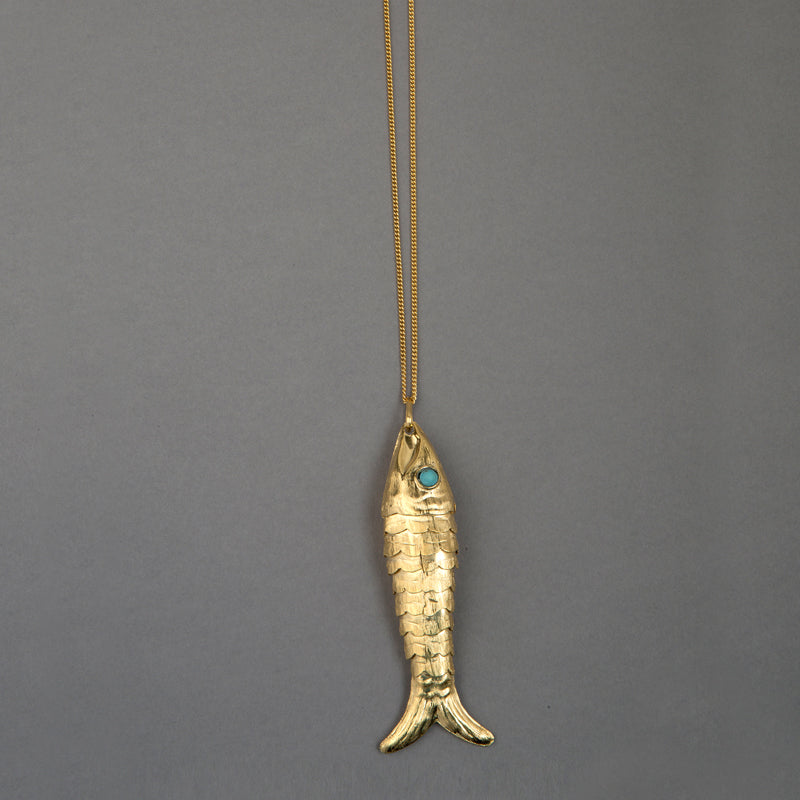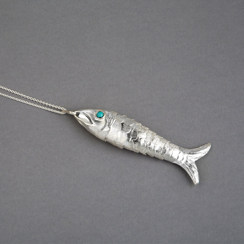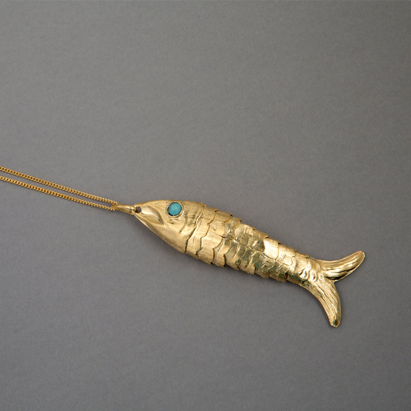 Collar de plata 925 y baño de oro de 24 quilates, de diseño milenario, con escamas articuladas y ojos de turquesa. Elaborado a mano por artesanos mexicanos.